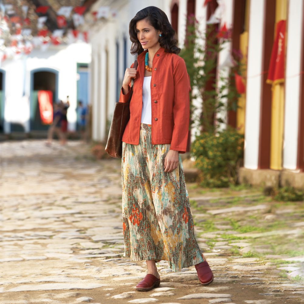 Bright swaths of Indian paisley reverse to a classic khaki solid in this cotton voile travel skirt. The colorful patterns and neutral khaki coordinate with almost everything in your suitcase, and the crinkled broomstick style requires no ironing.