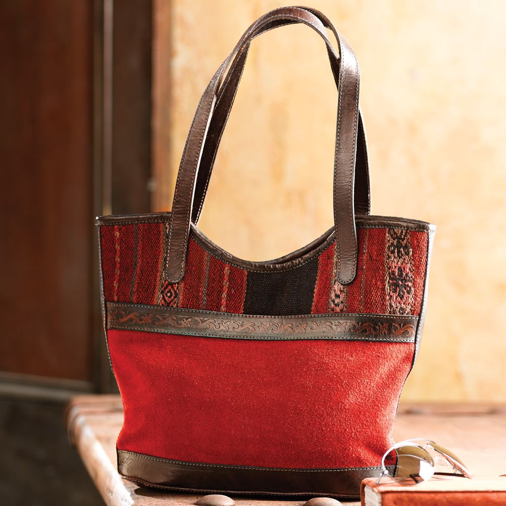Woven textiles called mantas or aguayos are an essential craft among the indigenous Aymara and Quechua people of the Andes. Decorated with simple geometric patterns, mantas are used as blankets and baby slings, as well as tailored into clothing. Pieces of handwoven mantas are combined with soft red suede to create this versatile handbag. Velvet-lined straps prevent them from slipping off your shoulder. Features a flat bottom, magnetic clasp, and one inside zip pocket. As each manta is unique, please expect variation in color and pattern.