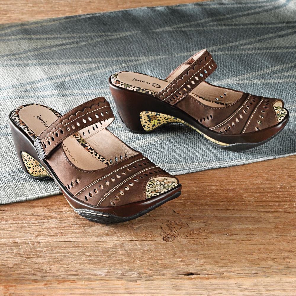 With cushioned comfort and a little lift, these lightweight Mary Jane sandals slip off easily at airport security and keep you going through long days of sightseeing. The foot bed is leather-covered, shock-absorbing foam to reduce fatigue. The compressed rubber wedge outsole offers durability and superior traction, and has a floral design. The nubuck leather strap is laser-cut with lacy details.