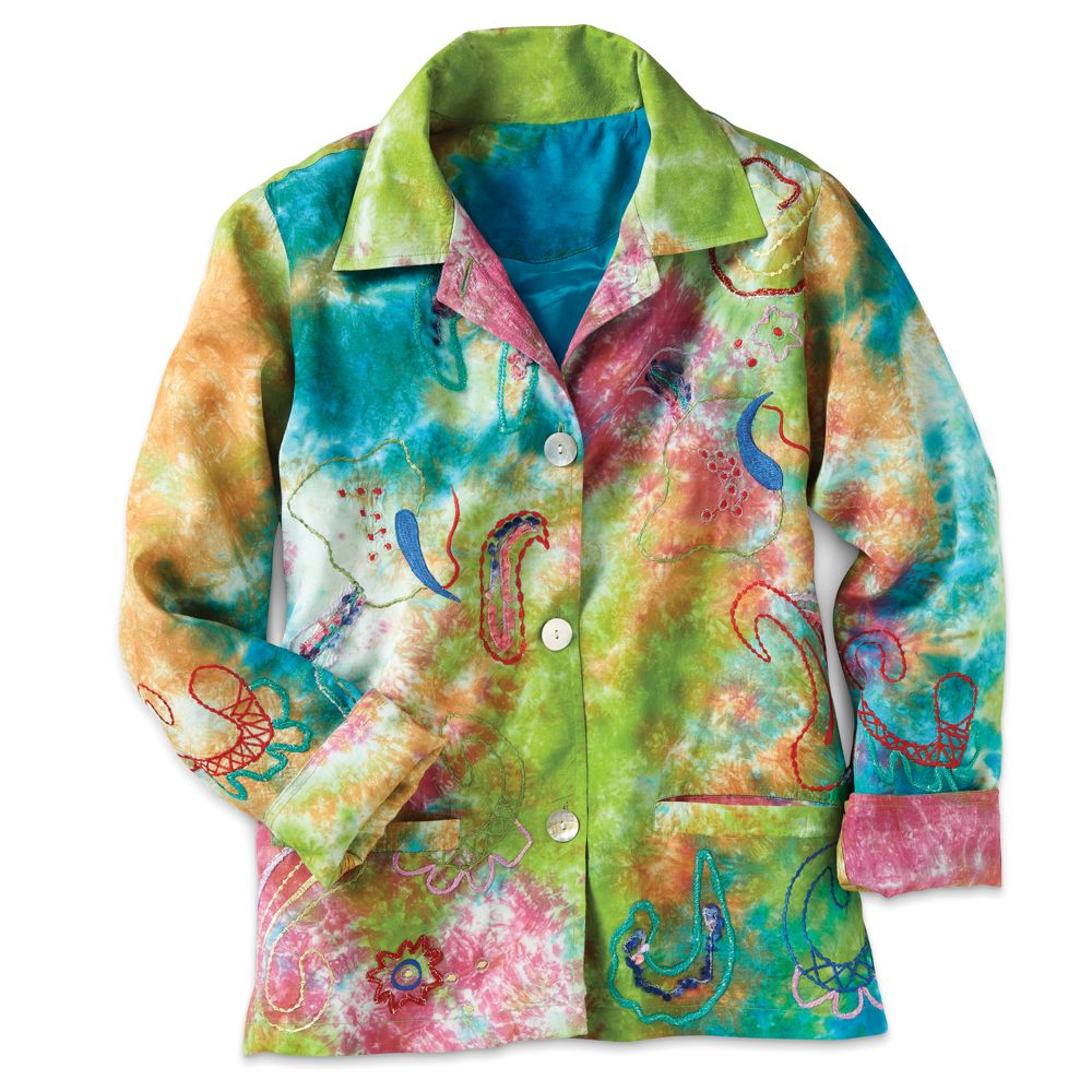 Gurgaon is one of India’s fastest growing cities, but family-run craft studios still flourish amid the international businesses that are fueling the economic boom. Our colorful, lightweight jacket is made in one of these studios. Tie-dyed by hand, each jacket is unique, with hand-embroidered paisley patterns on the front and one large paisley motif on the back. Paisley patterns, based on a stylized mango leaf, have been popular ever since merchant sea captains began bringing Indian textiles back to Europe and the U.S. in the 1700s. Two front patch pockets, fully lined.